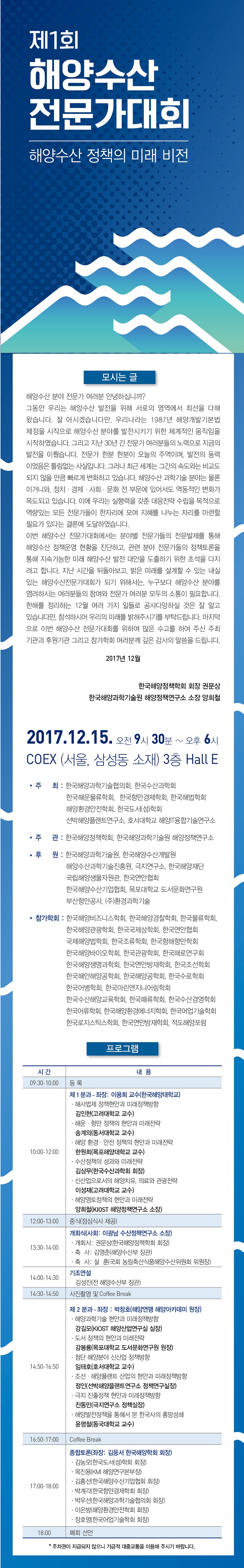 제1회 해양수산 전문가대회 초청 (해양수산 정책의 미래 비전) 페이지 정보 작성자 관리자 작성일17-12-08 14:21 조회11,463회 관련링크 이전글 다음글 목록 본문 . 이전글 다음글 목록