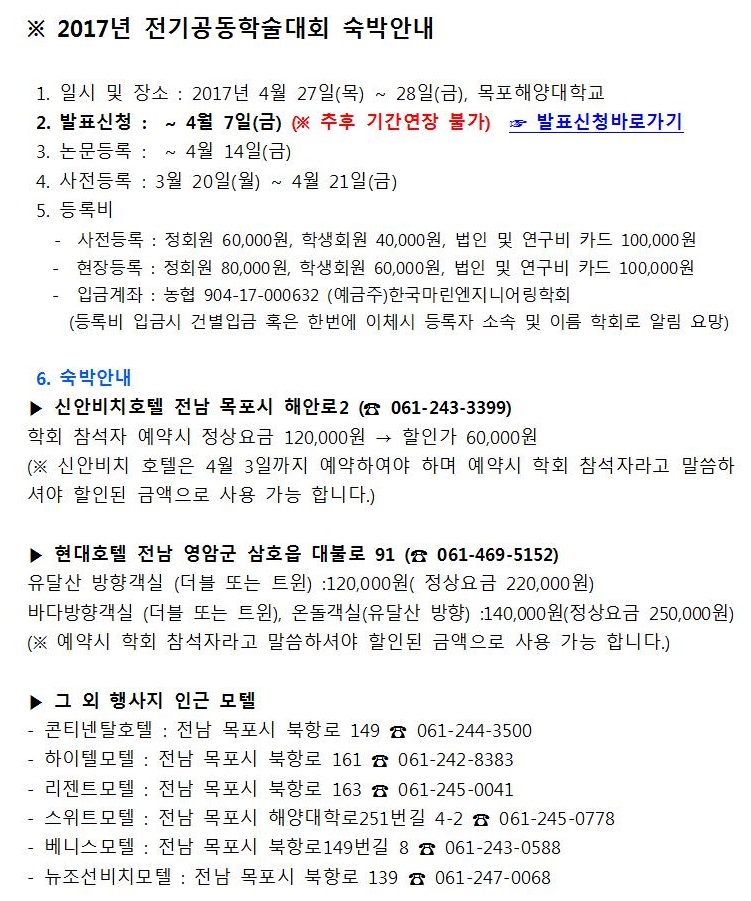 2017년 전기공동학술대회 숙박안내 페이지 정보 작성자 관리자 작성일17-03-13 10:43 조회11,326회 관련링크 이전글 다음글 목록 본문 ※ 신안비치호텔 외 행사장 근처 숙박안내 이전글 다음글 목록