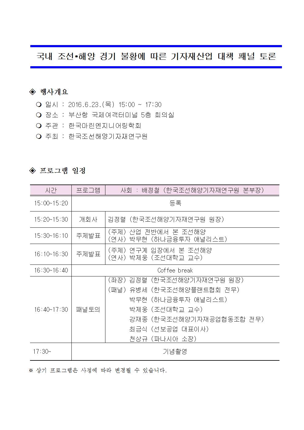 국내 조선∙해양 경기 불황에 따른 기자재산업 대책 패널 토론 안내