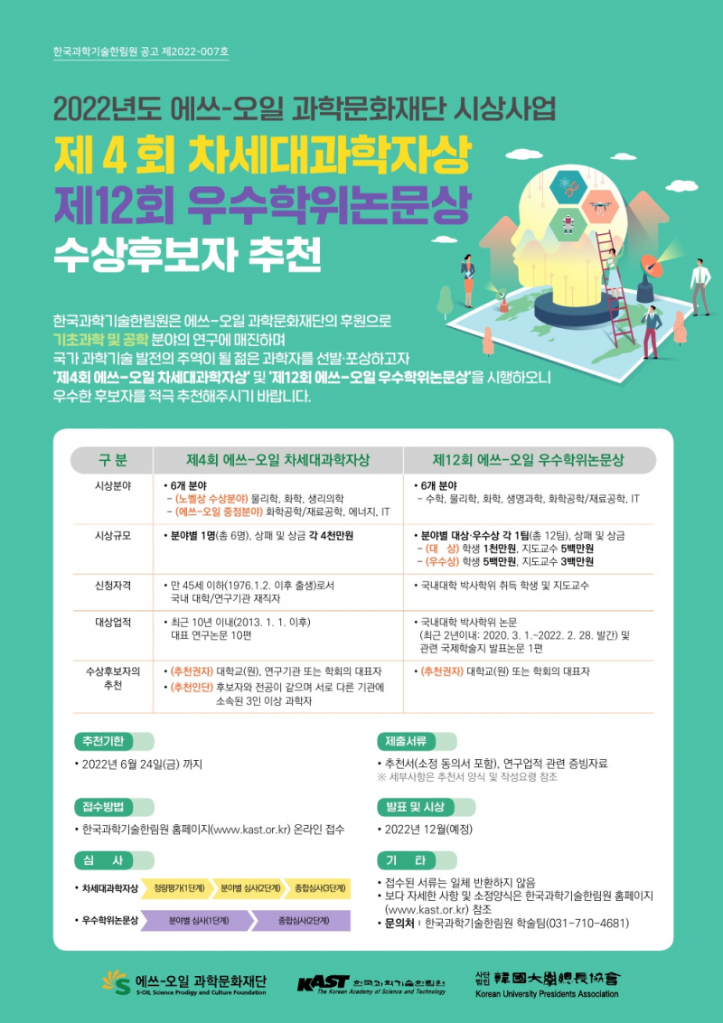 [한국과학기술한림원] 2022년도 에쓰오일 과학문화재단 시상사업 수상후보자 추천 협조 안내