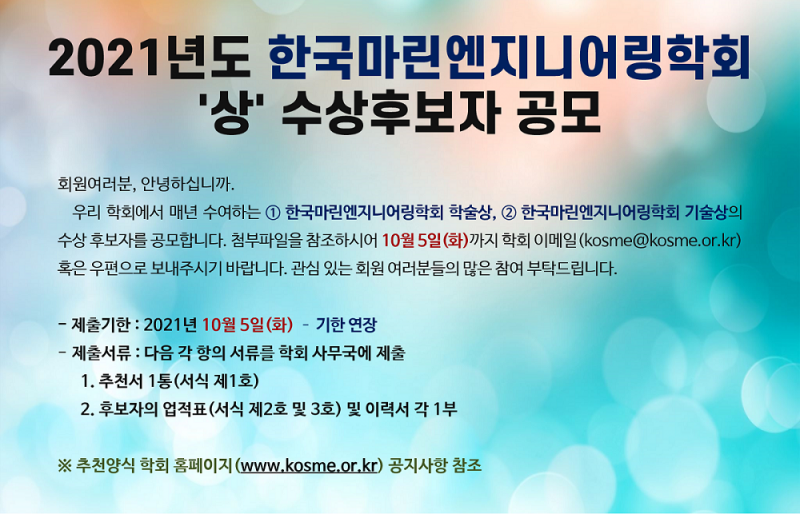 2021년도 한국마린엔지니어링학회상 후보자 공모 - 기한 연장 페이지 정보 작성자 최고관리자 작성일21-08-23 10:34 조회10,140회 관련링크 이전글 다음글 목록 본문 . 이전글 다음글 목록