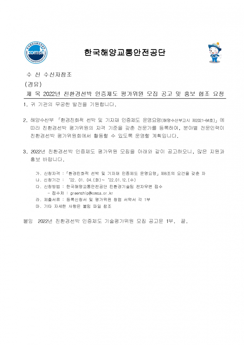 [한국해양교통안전공단] 2022년 친환경선박 인증제도 평가위원 모집 홍보 협조 안내