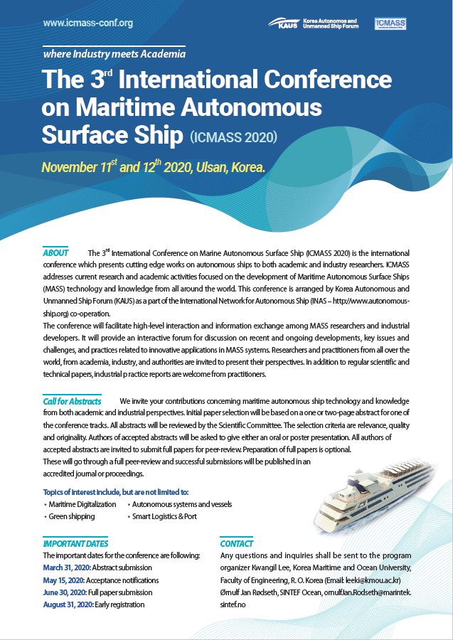 The 3rd International Conference on Maritime Autonomous Surface Ship 페이지 정보 작성자 관리자 작성일20-02-20 10:14 조회11,557회 관련링크 이전글 다음글 목록 본문 . 이전글 다음글 목록