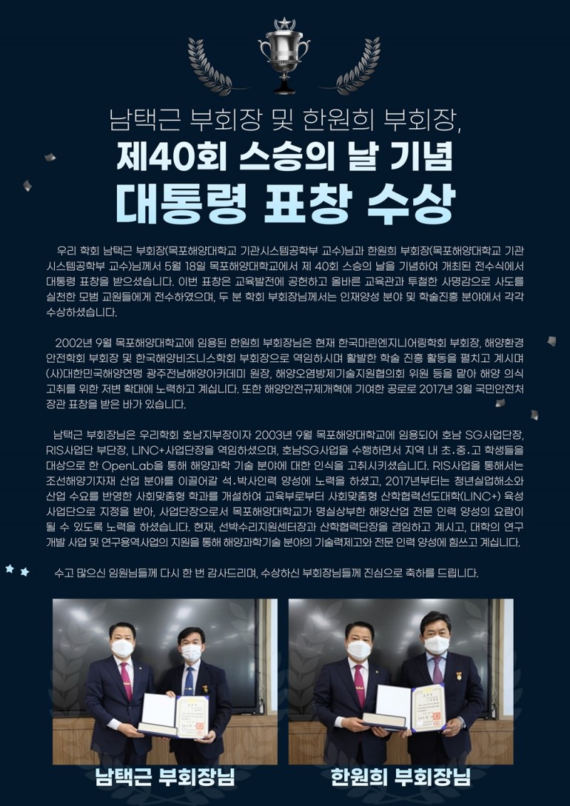 남택근 부회장 및 한원희 부회장, 제40회 스승의날 기념 대통령 표창 수상 페이지 정보 작성자 최고관리자 작성일21-05-20 17:05 조회4,214회 관련링크 이전글 다음글 목록 본문 이전글 다음글 목록