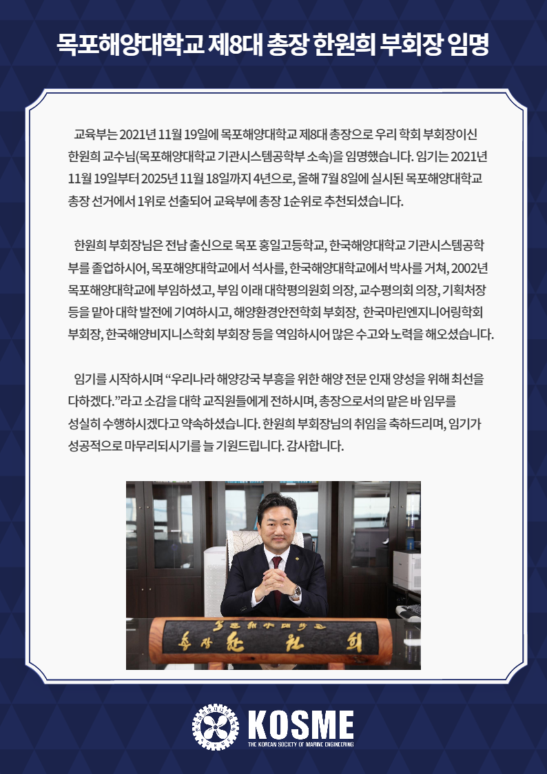 목포해양대학교 제8대 총장 한원희 부회장 임명