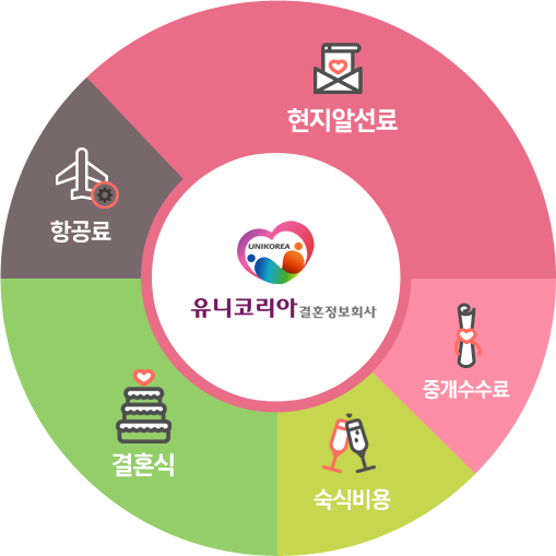 | 회사부담부담 | 신랑항공료, 신부항공료, 숙식비용, 약식결혼식, 웨딩사진, 여행자보험, 한국남성 서류공증번역비 |