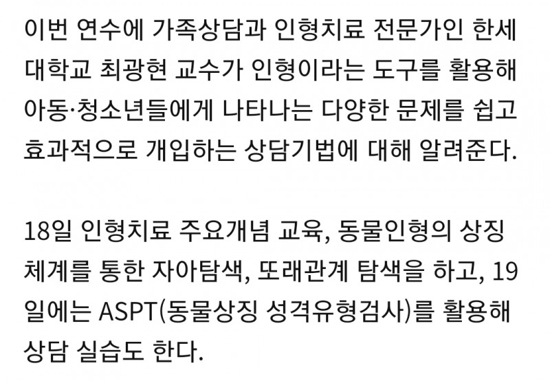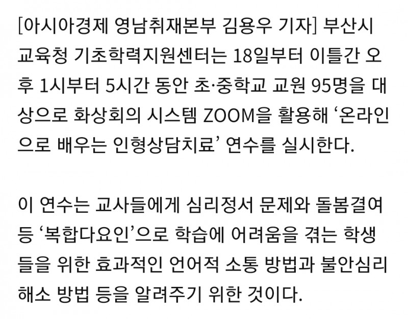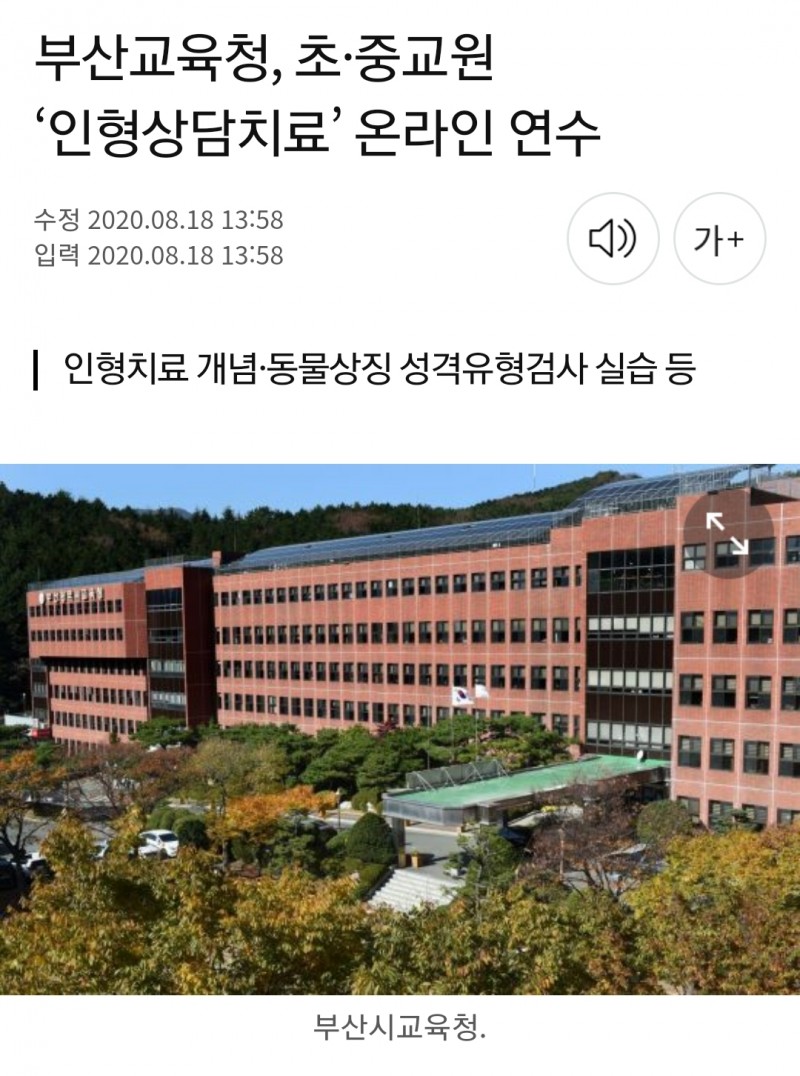 부산교육청, 초·중교원 ‘인형상담치료’ 온라인 연수 페이지 정보 작성자 최고관리자 작성일21-02-10 15:39 조회1,707회 관련링크 목록 본문 ·출처: https://view.asiae.co.kr/article/2020081813595550877 목록