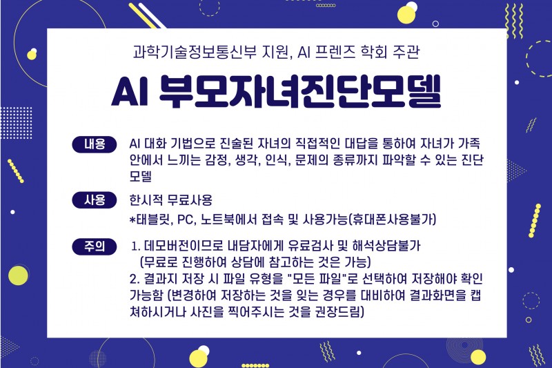 본 AI 부모자녀관계 진단모델은 과학기술정보통신부의 지원으로 AI 프렌즈 학회에서 주관한 AI 역량강화 사업으로 제작되었습니다. 본 모델은 부모와 자녀의 관계를 탐색할 수 있으며, 자녀가 자신과 부모에 대해서 어떤 인식을 하고 있는지를 파악할 수 있습니다.