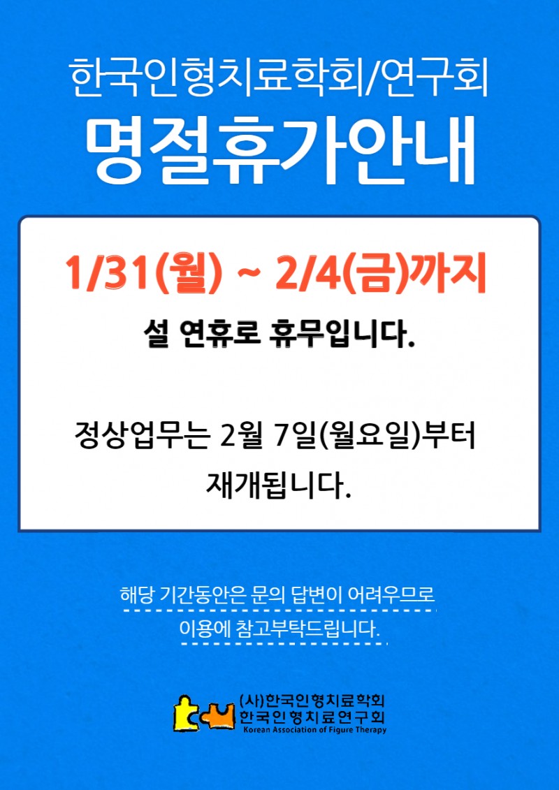 한국인형치료학회/연구회 명절휴가(1/31~2/4) 페이지 정보 작성자 최고관리자 작성일22-01-29 21:04 조회5,671회 관련링크 이전글 다음글 목록 본문 이전글 다음글 목록